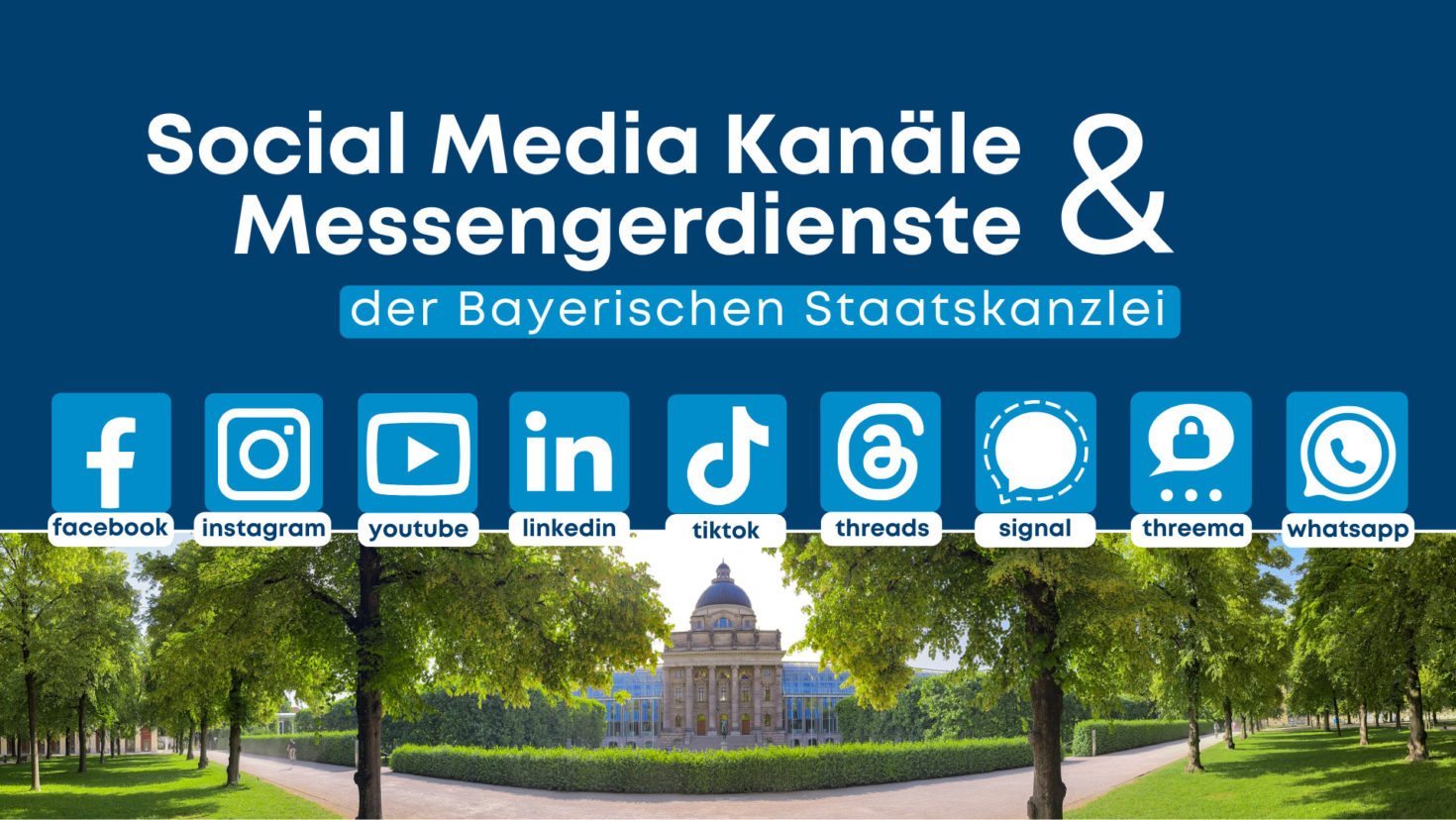 Folgen Sie uns auf Social Media für schnelle und zuverlässige Informationen rund um die Bayerische Staatsregierung und Termine der Staatskanzlei.